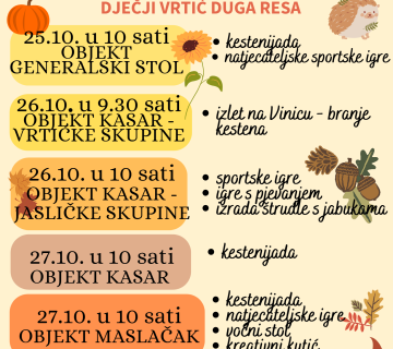 07/10/2022vrtićke skupine objekta Resica (“Pčelice”, “Pandice”, “Zrakice”, “Školjkice” i “Gljivice”) u sklopu projekta “Šuma” i povodom prvog dana jeseni (23.09.2022.) ...