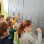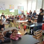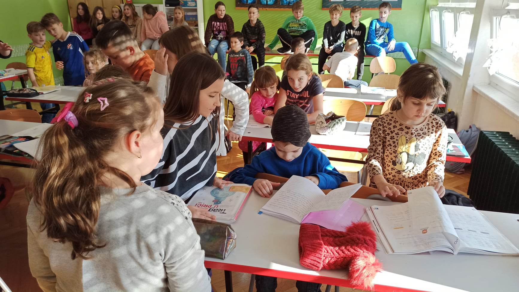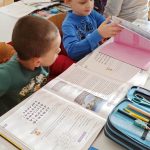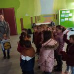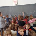 Djecu su radosno dočekali stručna služba, učiteljice i ravnateljica, kako bi što manje bili u tremi i kako bi se osjećali dobrodošlo. Oni nas vode u 1.a i 1.b razred gdje predškolarci imaju priliku vidjeti kako izgledaju učionice! Pregledali su svoje buduće školske knjige, pisali po ploči te nosili školske torbe. Neka dječica bila su malo sramežljiva pa im ravnateljica govori kako se ničega ne trebaju bojati – osim što će u školi učiti, imat će se prilike i poigrati!