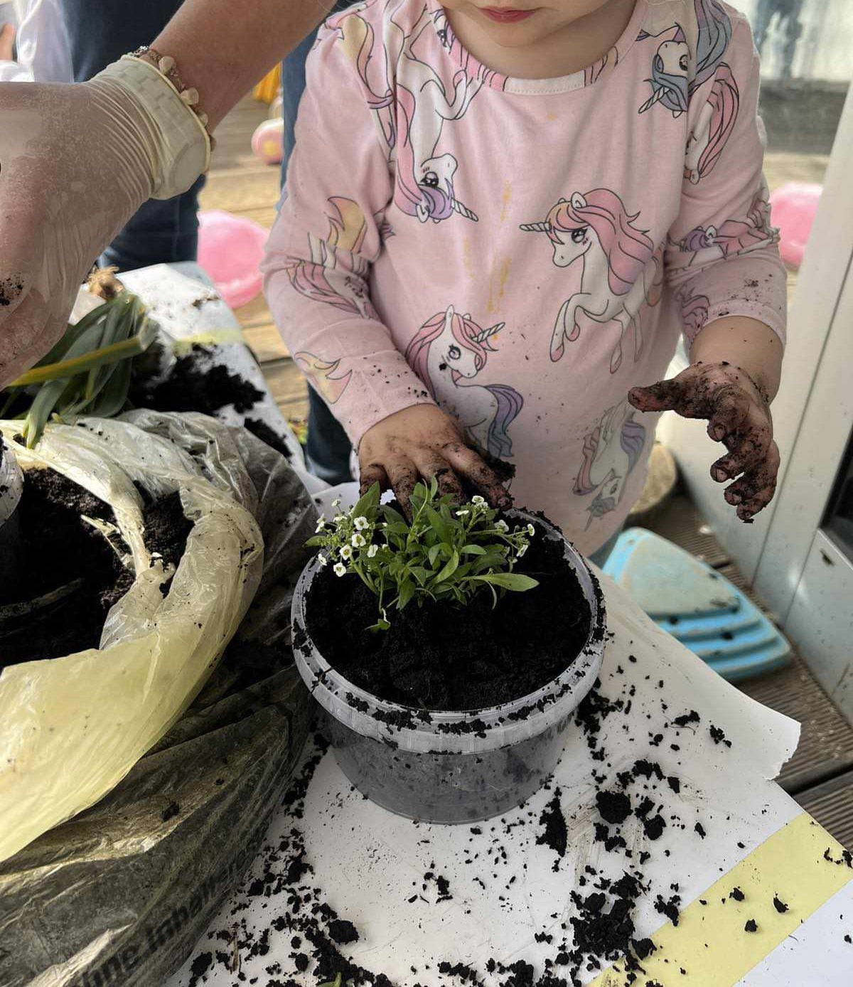 Svojim su vrijednim ručicama djeca rado opipavala i istraživala strukturu zemlje, pritom je pažljivo stavljajući u teglice. Nakon što su posadila cvijeće, djeca su ga zalila vodom, kako bi naraslo lijepo i veliko.