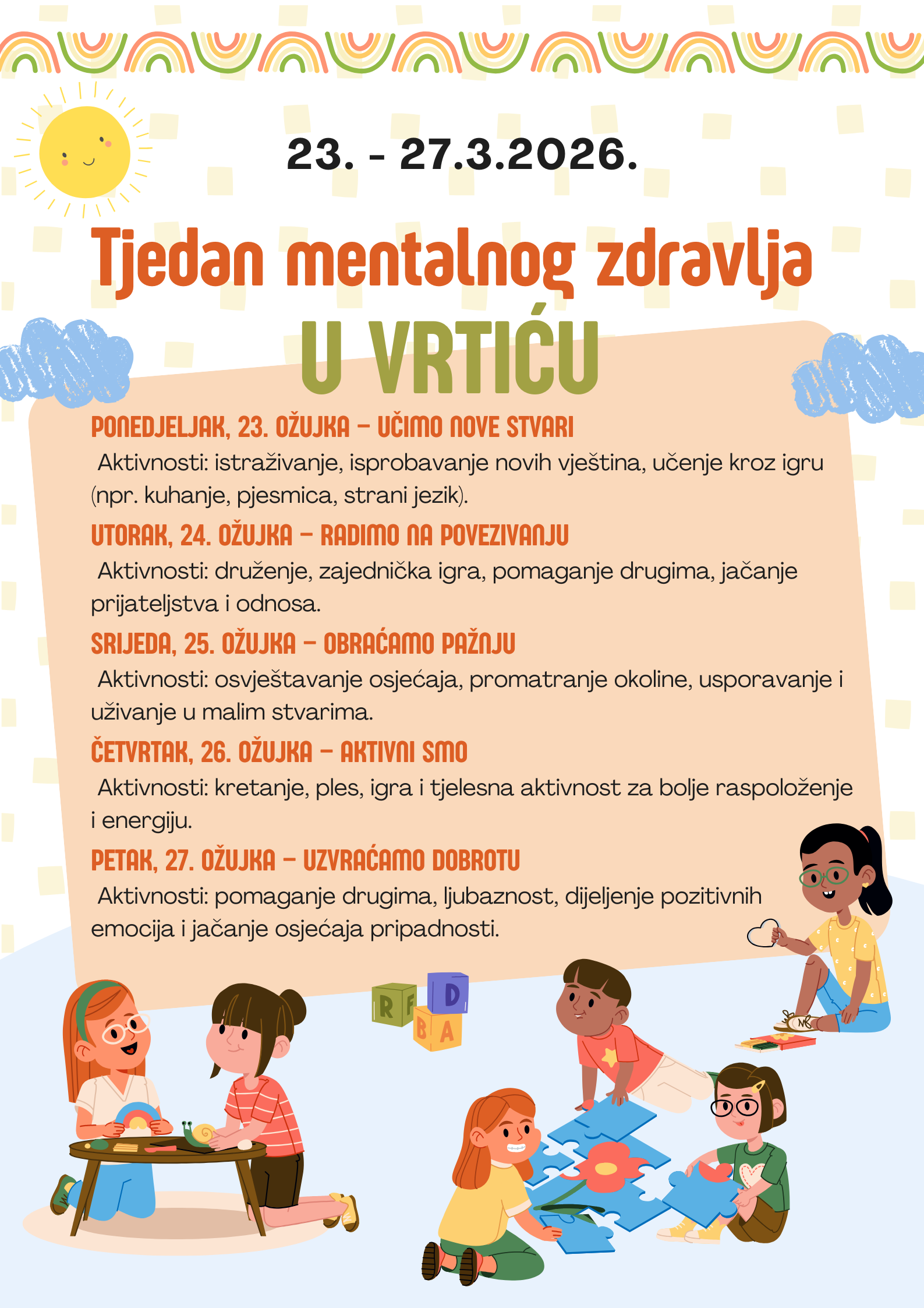 U tjednu od 23. do 27. ožujka 2026. godine u našem Vrtiću obilježili smo Tjedan mentalnog zdravlja. Ponedjeljak je bio dan za učenje novih stvari, utorak za povezivanje, srijeda za obraćanje pažnje, četvrtak za aktivnost, a petak za uzvraćanje dobrote. Primjere aktivnosti pogledajte na plakatu!